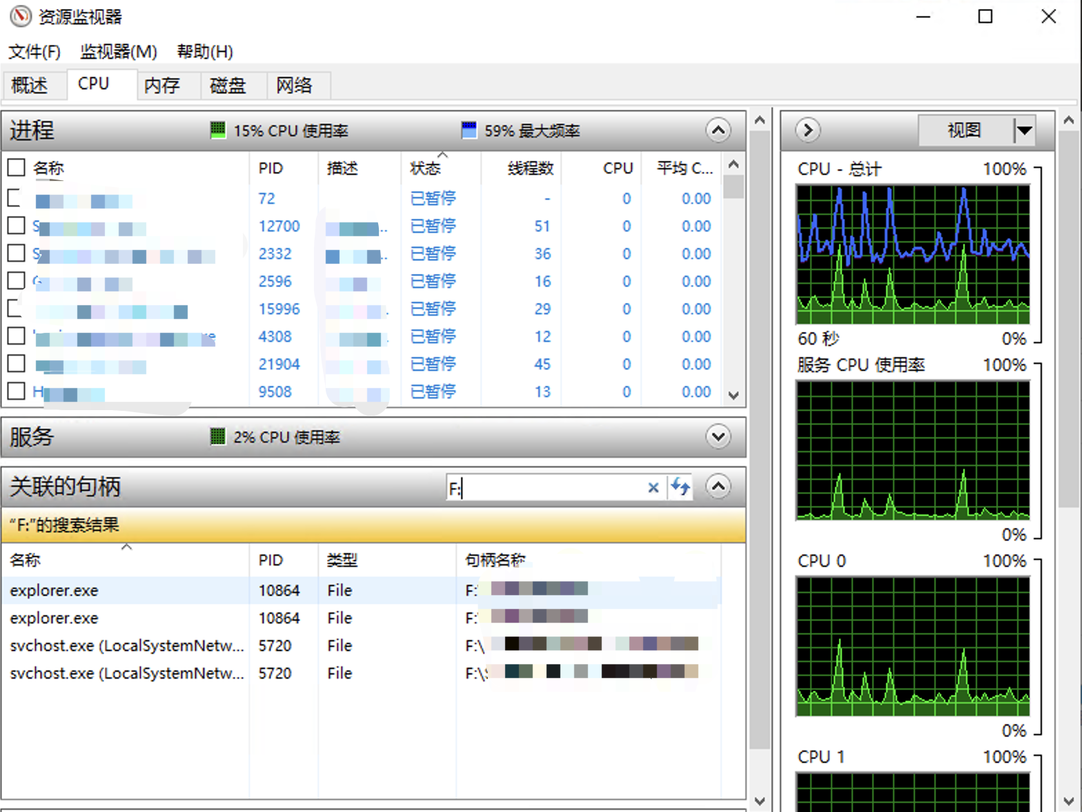 就可以搜索到占用这个盘符下文件的进程,这里千万小心‼️‼️,不可轻易杀掉这些进程,有些系统进程如果轻易杀掉会导致蓝屏等问题,不可轻易尝试,除非能确认这些进程的作用。