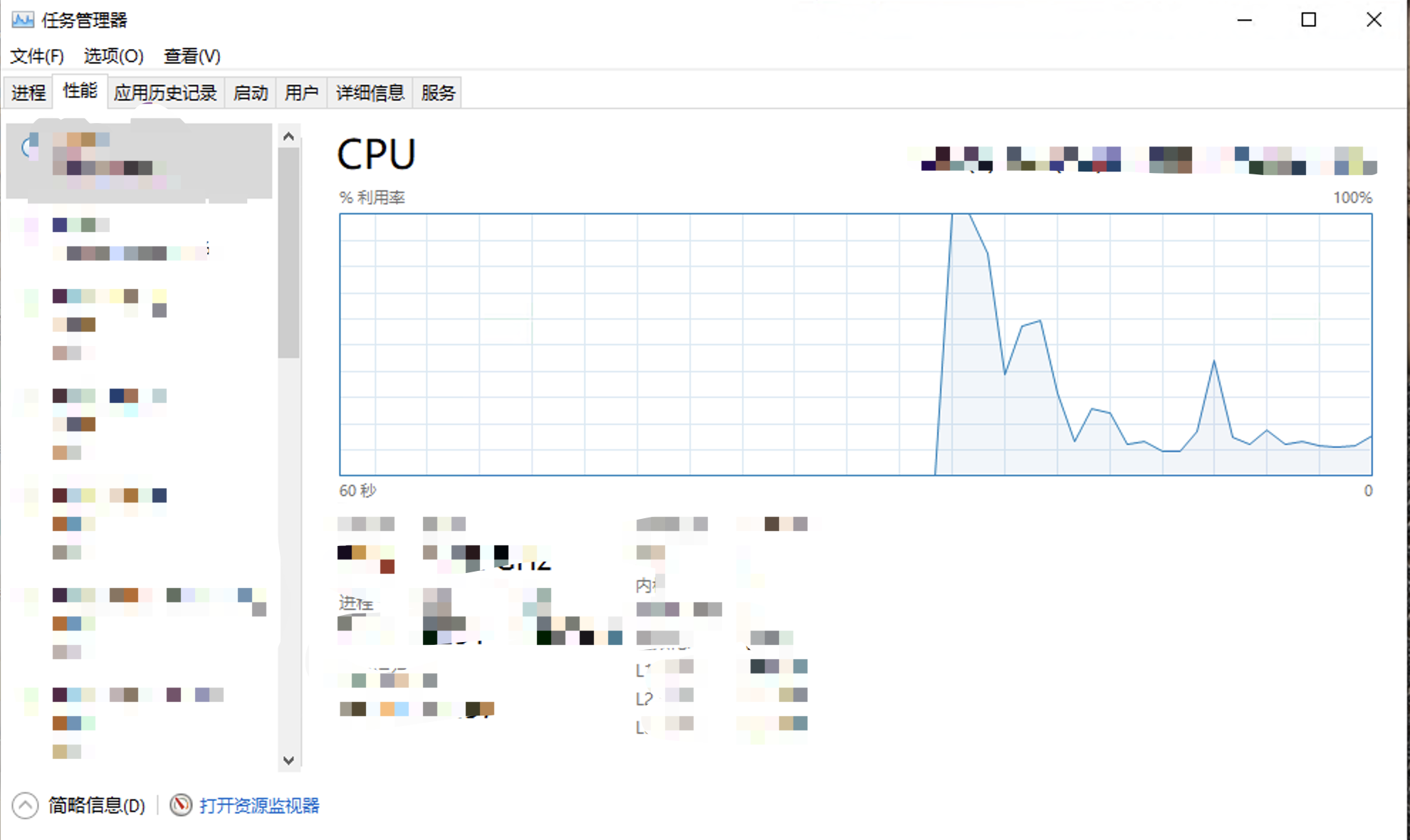 第二种方式是 Windows 任务管理器中性能 tab 下的”打开资源监视器”,