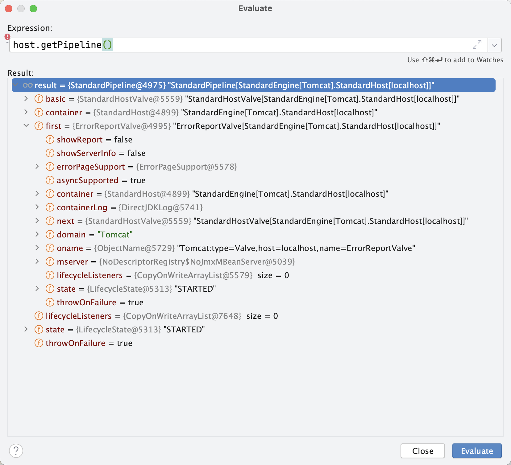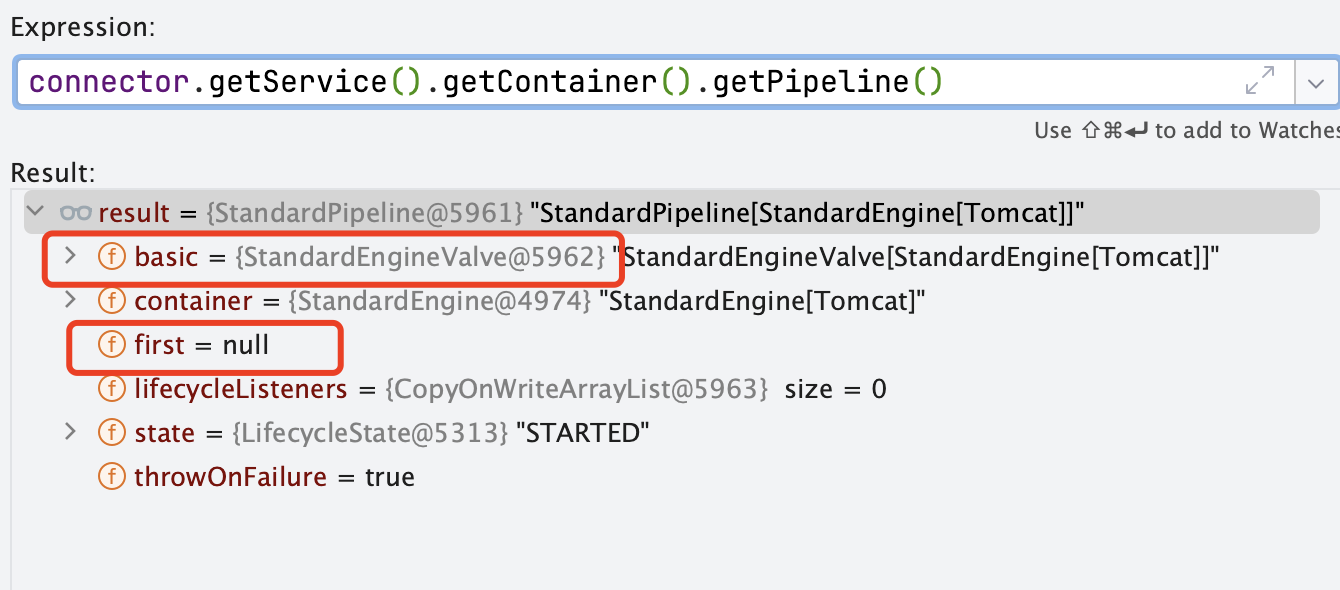 图中我们可以看到,对于 container 这个 pipeline,是没设置 first 的,只有 basic,basic 就是个兜底的 valve,在 StandardPipeline 中的 getFirst 实现1