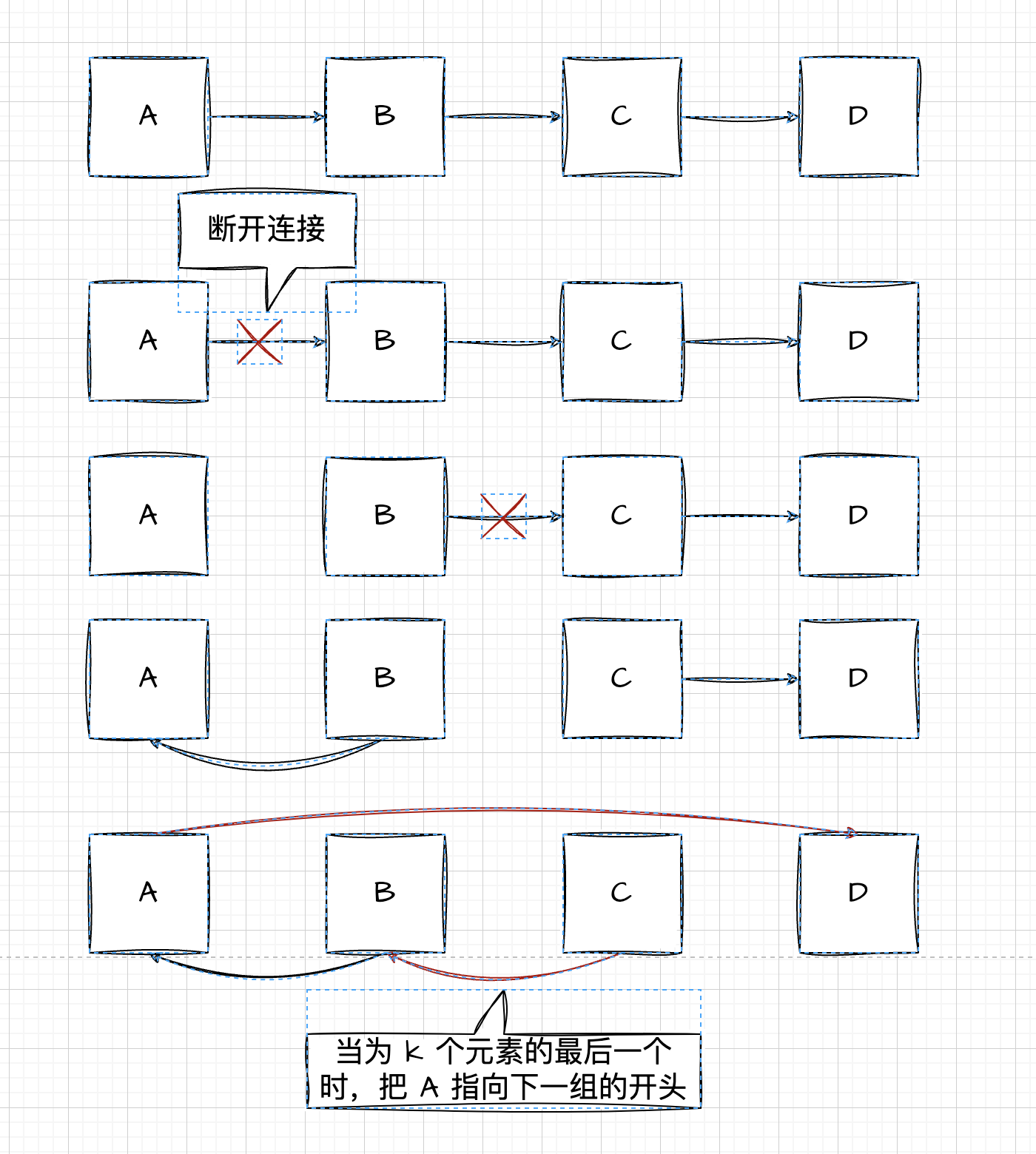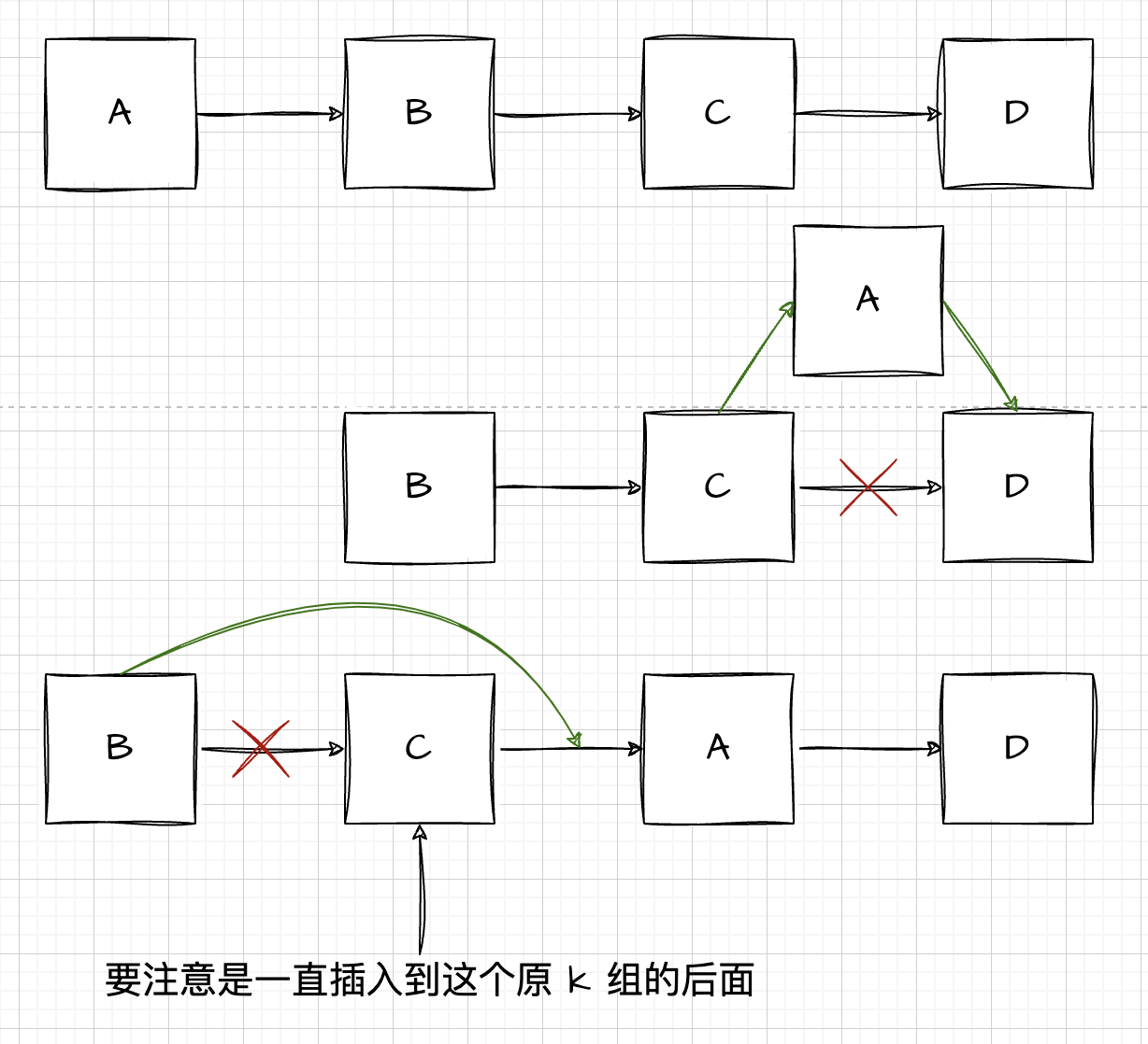 一开始的思路是这样的,想了下其实还是比较有问题,从处理难度上来说,在 k 组内处理的时候一开始 A 节点会是悬空的,然后得处理到组内最后一个元素的时候再接上,逻辑会更复杂,而另一种思路就是直接把 A 先挪到 C 后面,这样每次只需要移动一个,可能思路上会更清晰一点