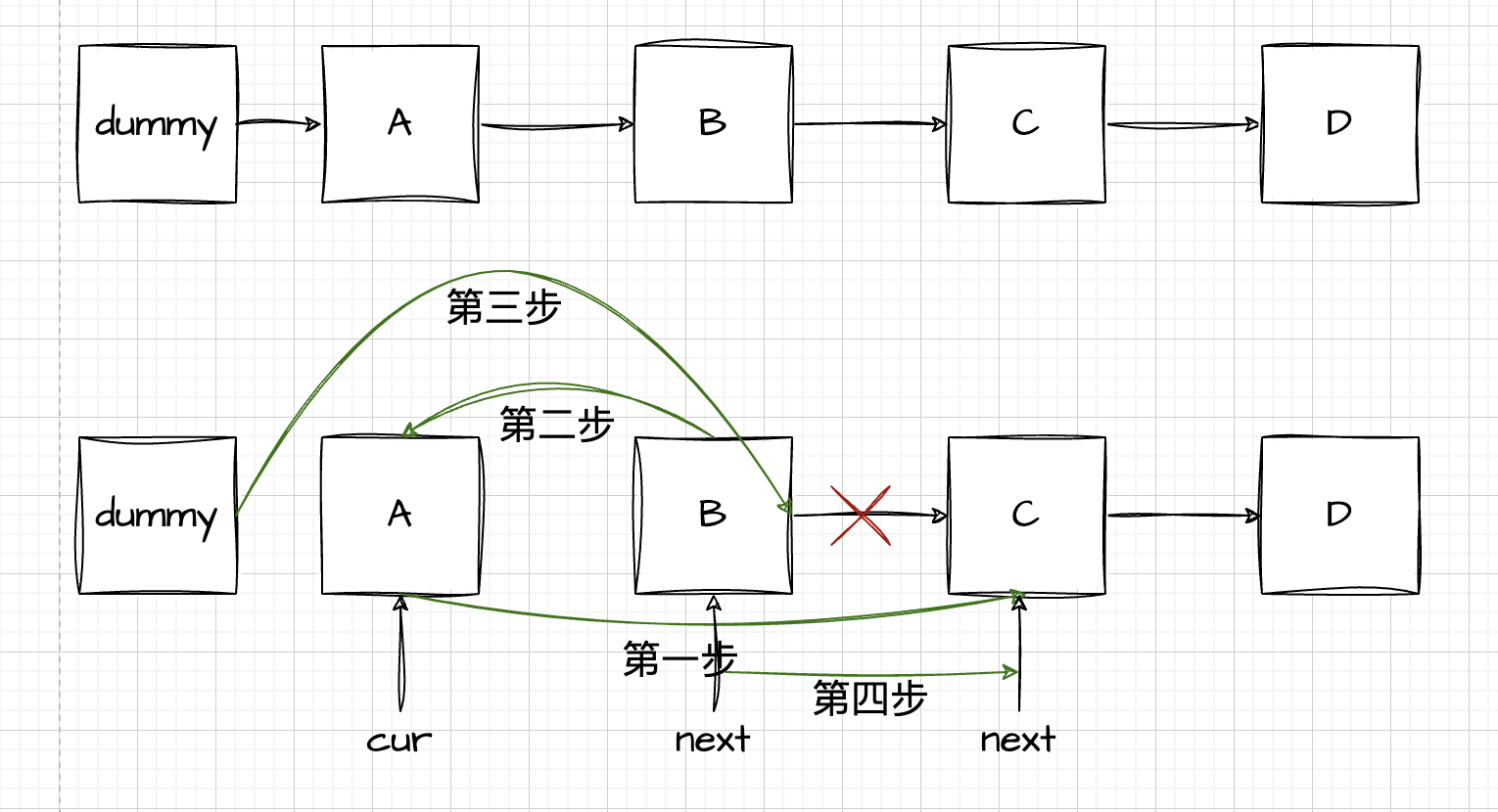 也就是图里的,第一步先把 cur 的下一个节点设置成 next 的 next 节点,这里就是图里 A 连接到 C,第二步是把 next 的 next 节点设置成虚拟头的 next节点,第三步是把 pre 的next 节点设置成 next,第四步是 next 往后移动1