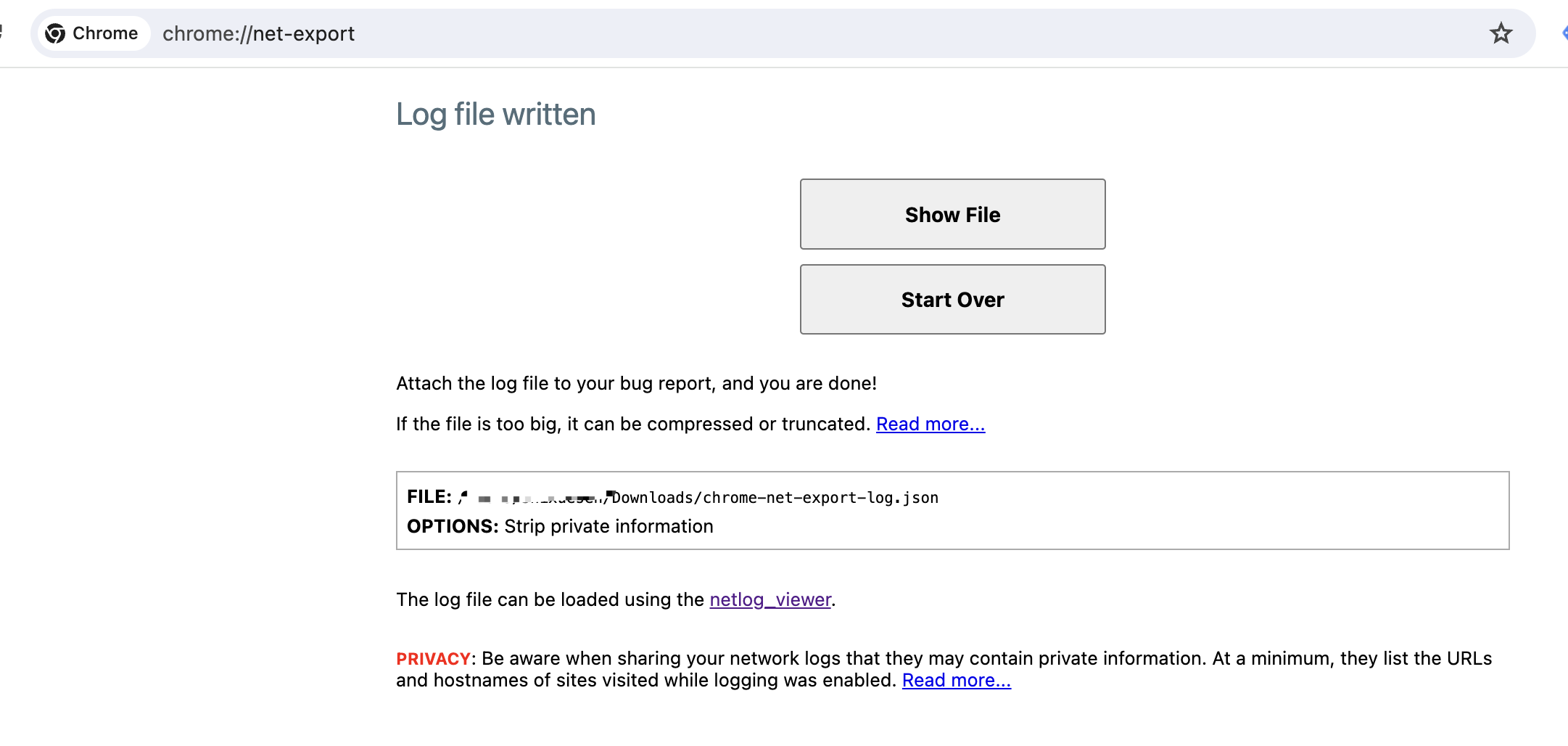 为了学习这个过程,我们尝试用 Chrome 的自带抓包工具,以往这是可以通过在 Chrome 地址栏中输入 chrome://net-internals/#events 来打开,现在变成了两部分,chrome://net-export/ 这里可以开始抓包,然后会记录下一个抓包日志文件里,