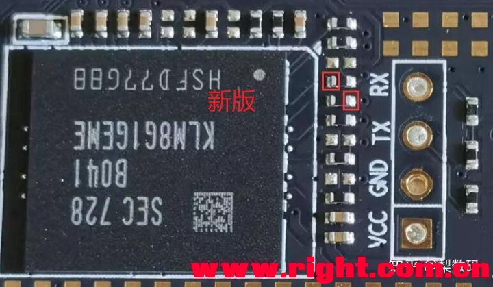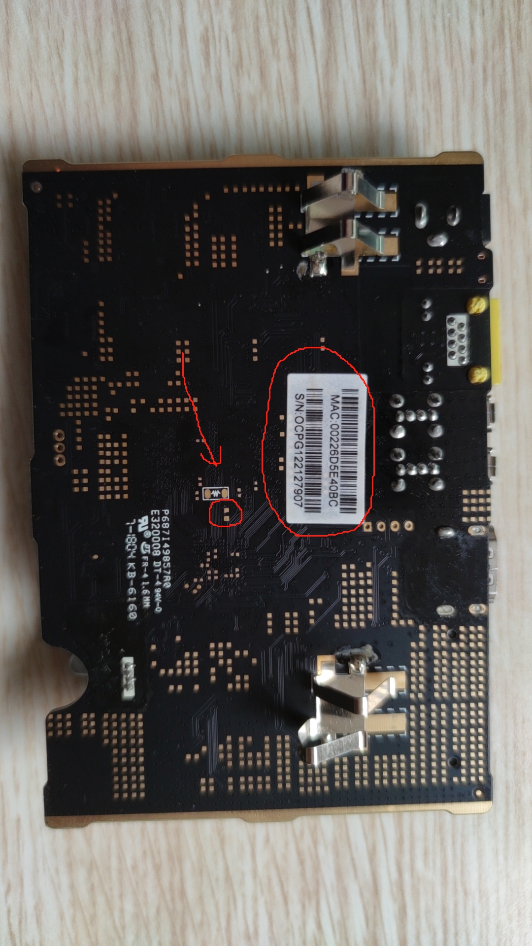 可以看上图的标示,箭头指向的是短接点,这是1.0版本的,1.3版本是找不到这个短接点,而是在反面(有S805芯片和存储的一面)