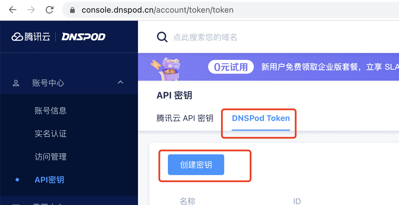 比如这样指定 webroot,另一个中更方便的方式就是通过 dns 认证的方式,我这边以 dnspod 举例,这边要特别注意的是 dnspod 虽然被腾讯云收购,但是这个方式还是需要用 dnspod 原来自己的 api token 验证的