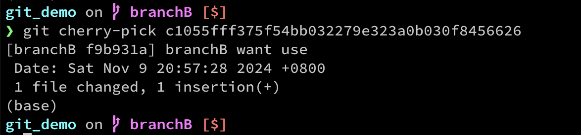 我此时就想把主分支之前那个提交内容给应用到我这个branchB,那就可以用cherry-pick