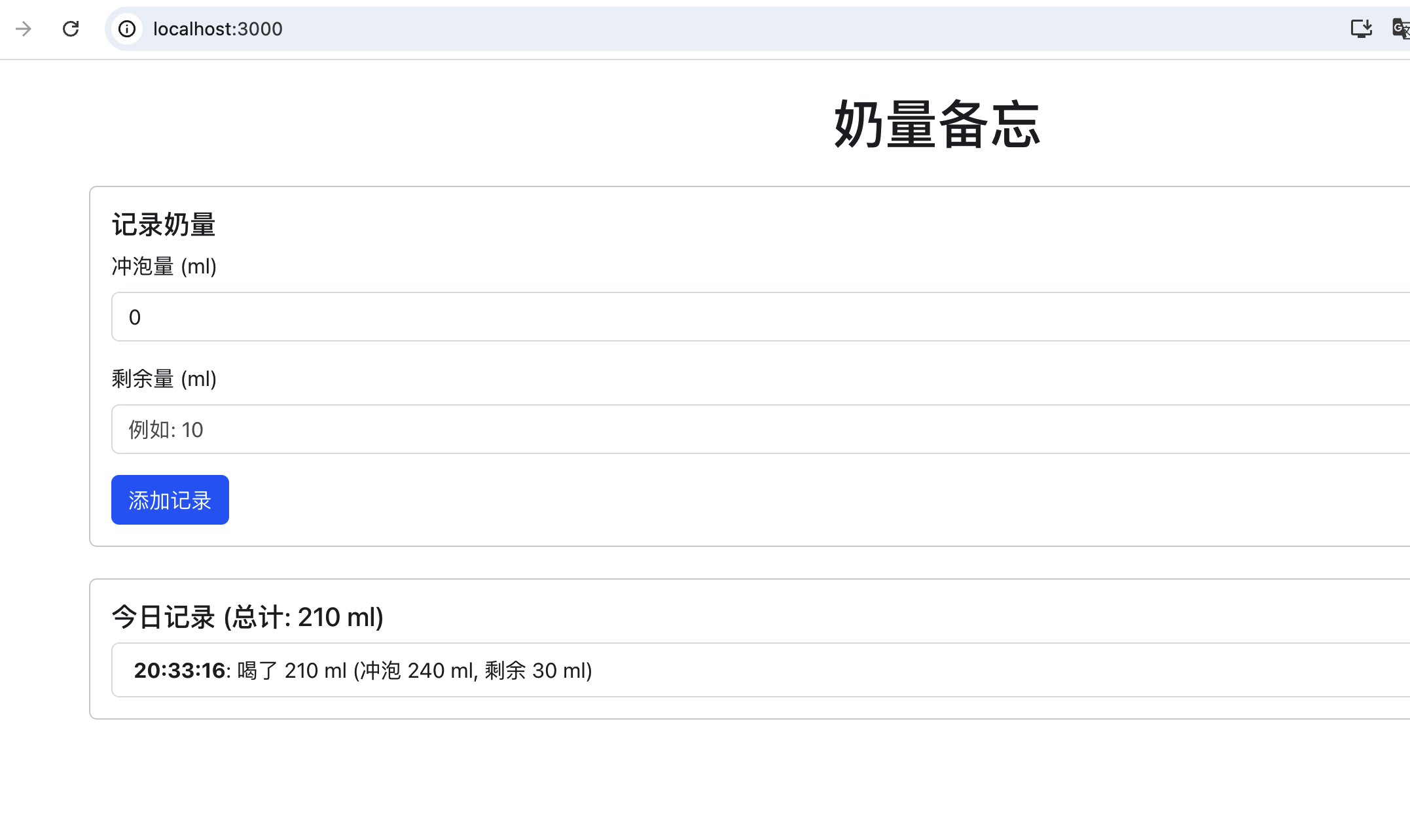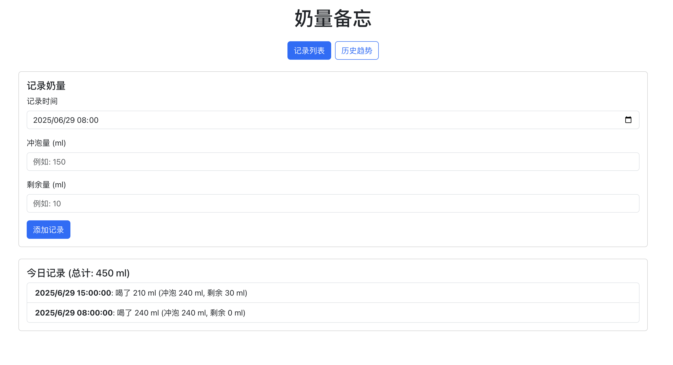 1. 记录喂奶量:一个简洁的表单,用于输入“冲泡量”和“剩余量”。提交后,应用会自动计算“实际饮用量”并记录当前时间。