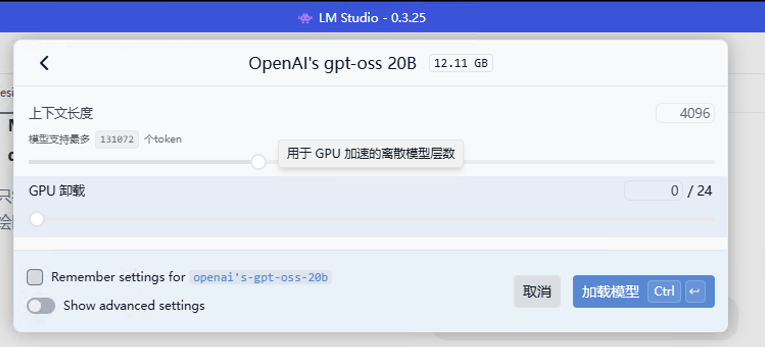 这个gpt-oss 20b是有24层,官标的显存需求是16g,我们有6g显存,大约可以加载8~9层的样子,并且lm studio也自动算出来是加载8层