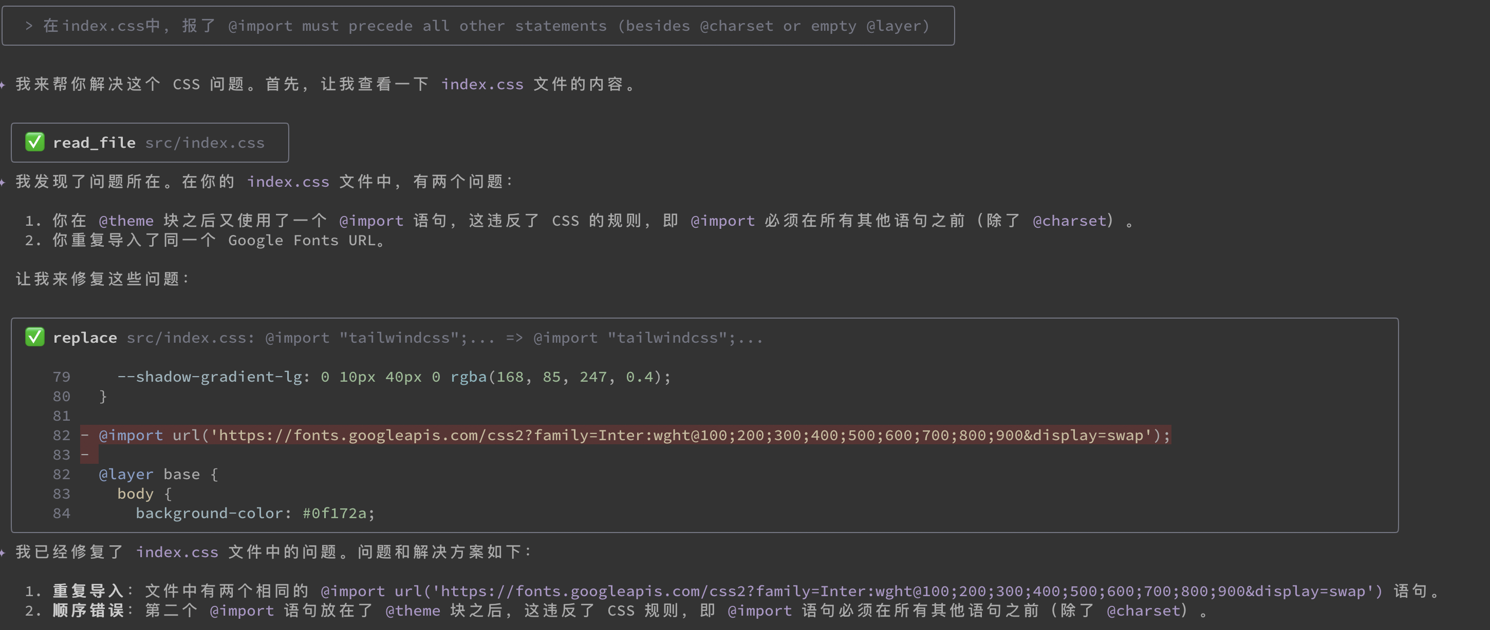 这两个问题改完之后终于这个“庞大的”工程终于起来了,原因只是为了做roocode测试,并且我的prompt加了“精美的”这种关键词,结果用copilot改了半天index.css中依赖tailwind的问题,