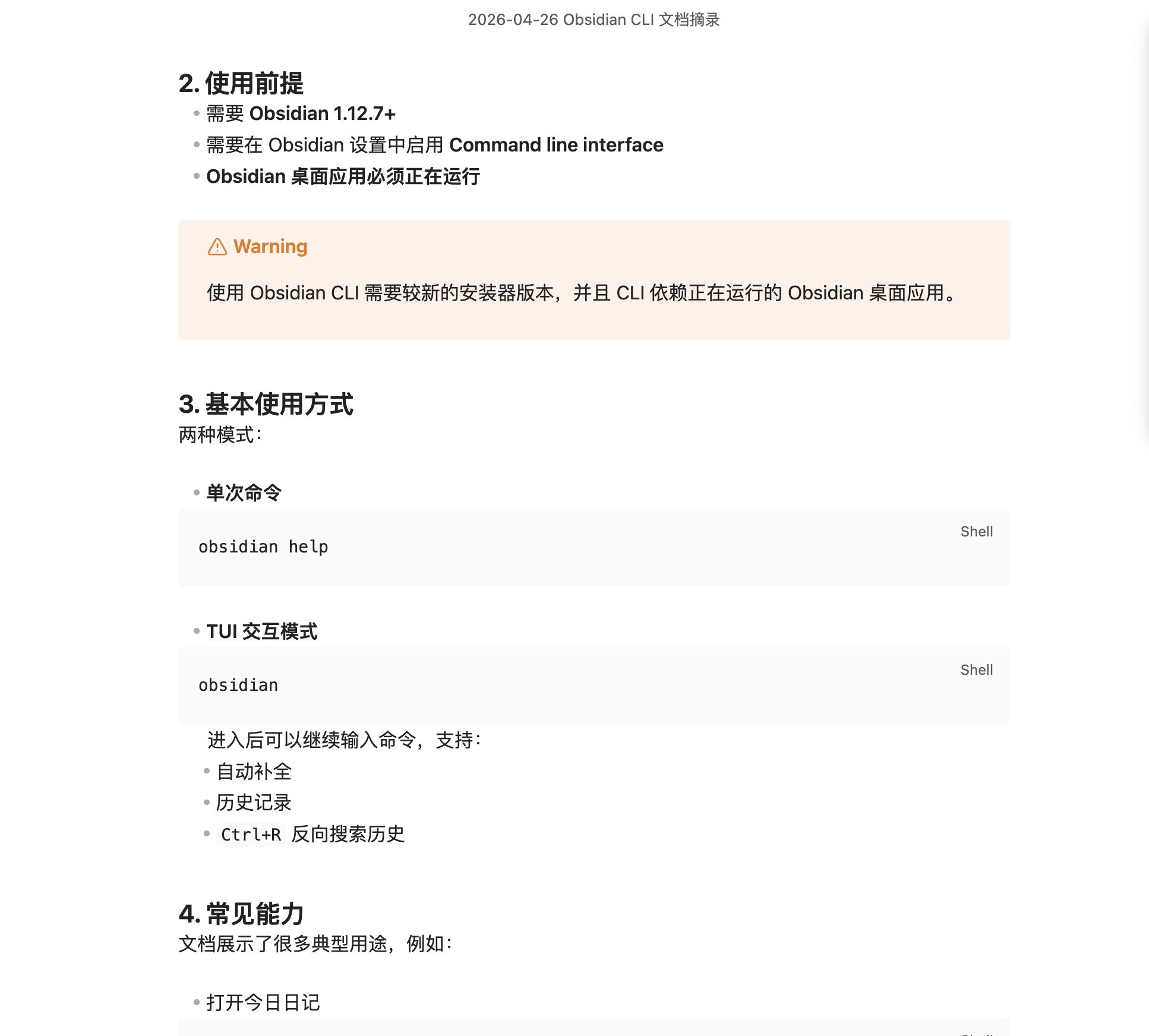 使用defuddle技能帮我摘录这篇文章 https://obsidian.md/help/cli